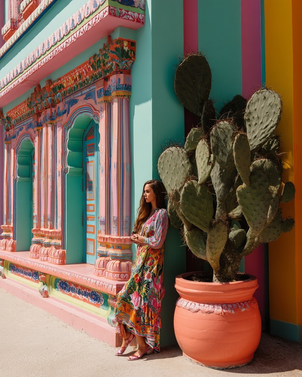 Создано на основе запроса: Colourful photo of an elegant woman with long hair in the style of pastel neon, posing next to teal cactus with pink edges and spikes. The woman is wearing a colourful patterned dressed Christian Lacroix. She is posing in front of a colourful building with intricate patterns and colourful alcoves. --- Автоперевод: Красочная фотография элегантной женщины с длинными волосами в стиле пастельного нена, позирующего рядом с кактусом бирюзового цвета с розовыми краями и шипами. Отлично вышло? 🤔 https://dzen.ru/id/65c0c65c86e4f837c27b24d7 #ИИ #AI #нейросеть #midjourney #art