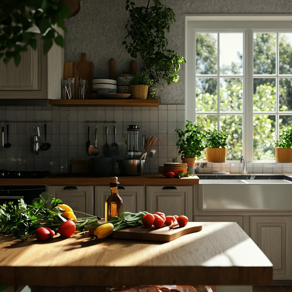 Можно обратить внимание как поменялись предметы на столе и общая атмосфера, после обозначения контекста деревни. Если наш замысел в том и состоял, чтобы добиться такого вайба, то мы значительно сузили варианты генераций. Для разнообразия сгенерируем еще одну кухню:
