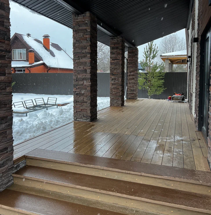 Оформление террасы — это всегда баланс между красотой и практичностью. Кажется, что важны крупные детали: покрытие, опоры, перила. Но на самом деле именно «мелочи» вроде ступеней и уголков определяют, насколько терраса будет удобной, безопасной и долговечной. Сегодня на примере одного из наших объектов расскажем, почему в некоторых местах уголок не устанавливается вовсе — и почему это совершенно логично. Когда по краям террасы идёт аккуратный уголок, всё смотрится завершённым. Он скрывает торцы досок, делает линии ровными, визуально «собирает» конструкцию. Особенно это заметно, если использовать композитную доску или террасную древесину с выраженной текстурой. Можно сказать, уголок — это как рамка у картины. Без него поверхность может выглядеть незавершённой. На одном из наших объектов — аккуратной террасе с классическими ступенями — заказчик сначала удивился: по всему периметру шёл уголок, а вот на верхней ступеньке его не было. Но решение оказалось простым и очень практичным. В этом