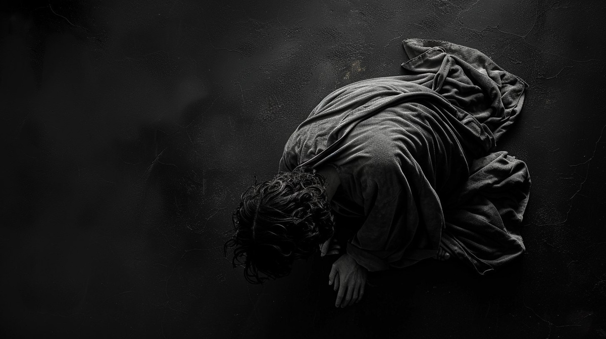 Создано на основе запроса: A bird’s eye overhead view of the back of Jesus' as he is crouched down to the ground in agony on a black