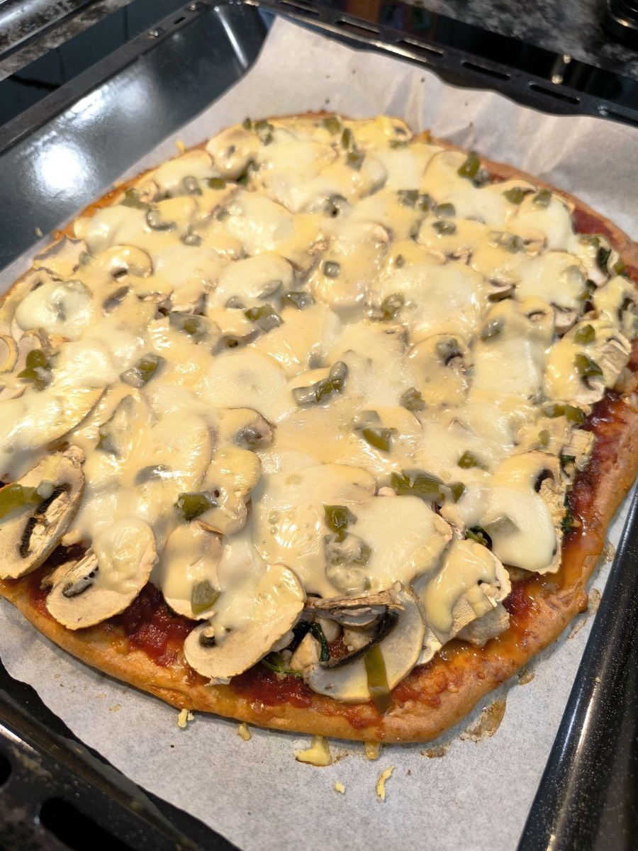3) Выложить на основу резанные томаты, курицу со шпинатом, шампиньоны, халапеньо, оставшийся тёртый сыр и моцареллу. Выпекать в духовке при 180 градусах 20 минут. Можно поставить только верх и выпекать при 200 градусах.