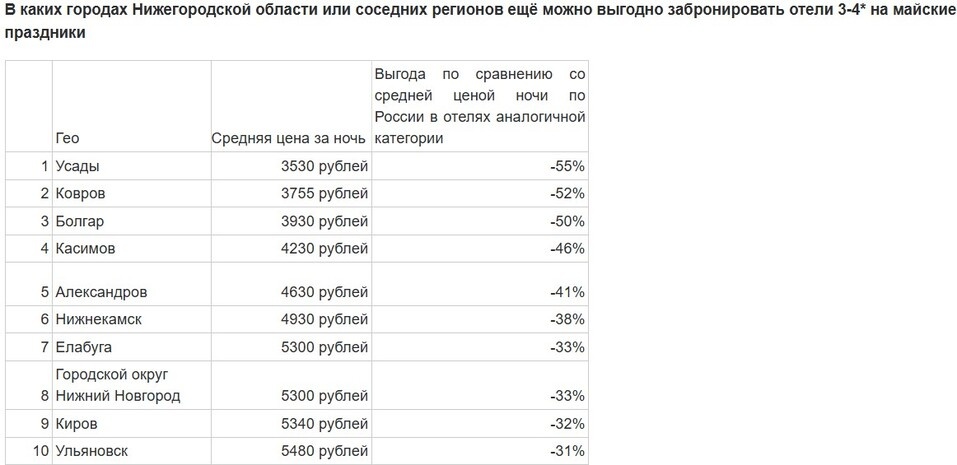 В 2025 г. самыми выгодным направлениями из Нижнего Новгорода для отдыха в майские праздники стали Усады (Татарстан), Ковров и Болгар (Татарстан). Стоимость ночи проживания в трёх- и четырёхзвёздочные отелях этих городов составляет от 3530 руб., от 3755 руб и от 3930 руб. (соответственно). По данным сервиса «Яндекс Путешествия», цены в гостиницах перечисленных населенных пунктов на 45-50% дешевле, чем в среднем по России. Среди крупных городов выгодные варианты отелей на майские можно найти в Астрахани (4400 руб. за ночь), Барнауле (4550 руб.) и Пензе (4740 руб.). Более дешевые варианты для семейных путешественников — в Чебоксарах (3720 руб.), Усадах (3750 руб.) и Рязани (4710 руб.), где ночи в квартирах и апартаментах до 30-40% дешевле среднего по стране. Ранее NN.DK.RU писал, что весной 2025 г. Нижний Новгород занял пятое место в рейтинге популярных для отдыха направлений России для отдыха на реках и озерах.