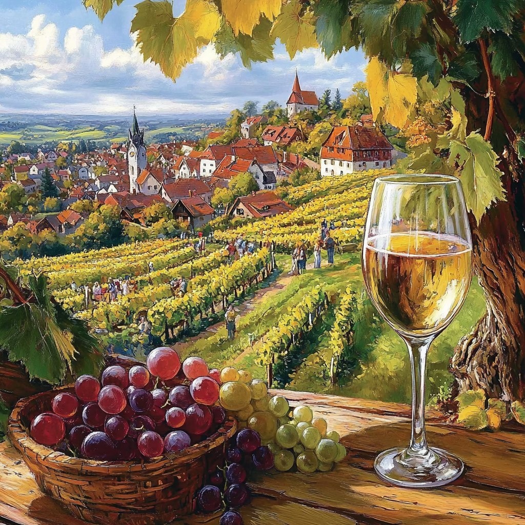 Создано на основе запроса: Make me a real picture of the wine with a Moravian village in the background where people will be having fun