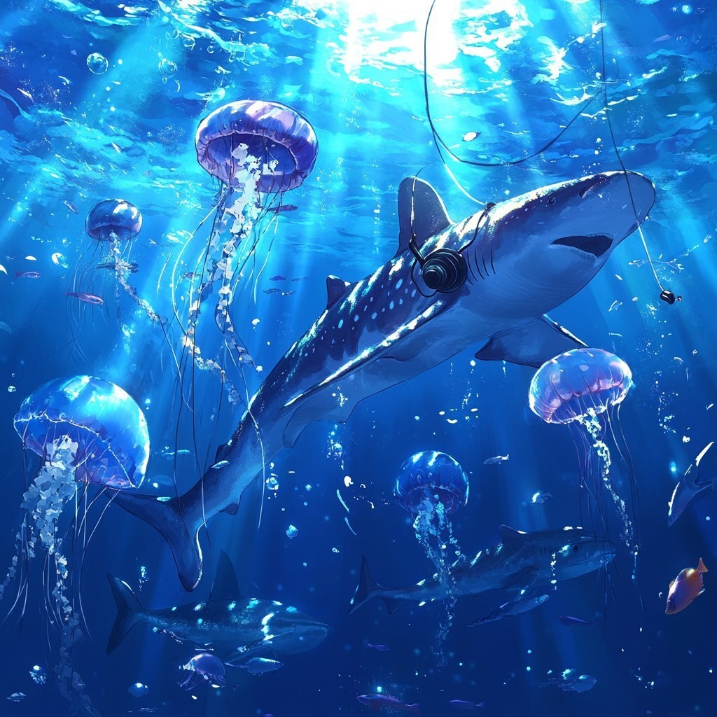 Создано на основе запроса: whale sharks and jelly fish listening to headphones underwater with sunlight streaming in a cartoon style similar