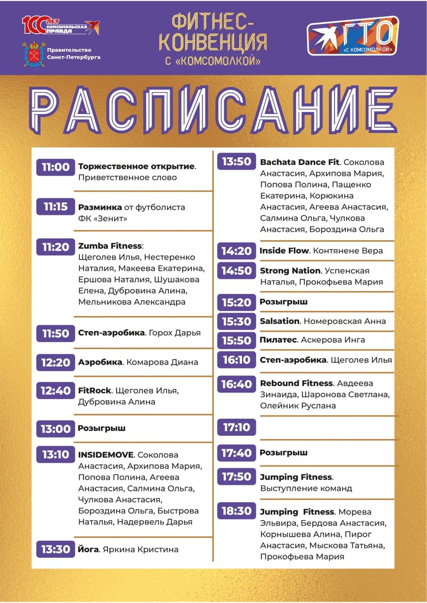 Что же будет на фестивале «ГТО с «Комсомолкой»? Теперь мы готовы представить программу! 1 мая с 11:00 до 19:00 в Легкоатлетическом манеже на Крестовском острове пройдет спортивный фестиваль «ГТО с Комсомолкой». И мы рады представить Вам расписание нашей фитнес-конвенции! Вас ждет насыщенная программа, включающая Zumba Fitness, аэробику, пилатес, jumping fitness, семейные квесты, увлекательные мастер-классы и многое другое. Участие бесплатное, но количество мест ограничено. Для сдачи нормативов потребуется медицинская справка и регистрация в системе ГТО. И обязательно берите сменную обувь! Мы с нетерпением ждем Вас на нашем фестивале! Больше подробностей - в нашем материале. Подпишись на Комсомольскую правду: СПб — отдай свой буст нам