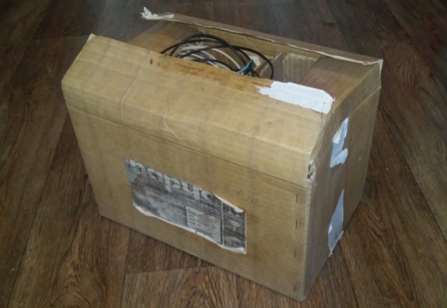 Этот компьютер, клон ZX Spectrum 48K в полном комплекте я обнаружил у знакомого инженера, работавшего, на заводе СПЗ "Парус" в период 1990-1995 гг. Такие коробки в какой-то момент раздали всем сотрудникам вместо зарплаты, перед закрытием предприятия. На момент съемки она пролежала в таком виде около 20 лет на одной из полок гаража знакомого. Коробка "Парус ВИ-201", распечатанная, стоит на полу На этикетке уже едва можно разобрать надписи Видеоигровое устройство "Парус ВИ-201". Севастопольский приборостроительный завод. Внутри лежат ещё 4 коробочки: в одной лежит блок питания, в другой манипулятор (джойстик), одна коробка для периферии (шнуров), сам компьютер в также в отдельной коробке. Изначально каждая деталь была упакована и запаяна в полиэтиленовую плёнку. Помимо этого там находятся две книжечки - инструкции. Итак, начнём с блока питания. Вот такой блочок: разъем для сетевого шнура, выход на DIN, индикаторный светодиод. Заявленное напряжение: 5В и ток 1,3А (гораздо больше по габари