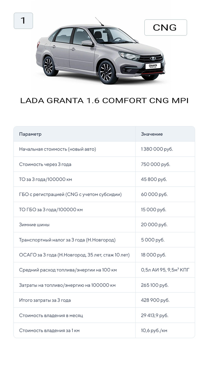 Союз Предприятий Газомоторной Отрасли (СПГО) провели независимое исследование и сравнили стоимость владения трех актуальных автомобилей на 2025 год с использованием различного топлива. В расчетах учтена начальная цена автомобиля, потеря стоимости за три года, затраты на техническое обслуживание и зимнюю резину, расходы на топливо, а также транспортный налог и ОСАГО. Сравнивали следующие автомобили: Стоимость топлива, размер налога и страховки взяли для водителя из Нижнего Новгорода, возрастом 35 лет и стажем вождения 10 лет. Предполагаемый годовой пробег составил 30 000 км. Стоимость переоборудования и затрат на регистрацию ГБО: *Оборудование для двигателей с непосредственным впрыском (DI) стоит вдвое дороже, чем для обычных (MPI) двигателей. Итоговый рейтинг стоимости владения в месяц и на 1 км пробега: 1️⃣ LADA GRANTA + ГБО CNG с учетом госсубсидии: 29 414 руб./мес, 10.6 руб./км 2️⃣ LADA GRANTA + ГБО LPG: 31 143 руб./мес, 11.2 руб./км 3️⃣HAVAL JOLION + ГБО CNG: 36 371 руб./мес, 13.