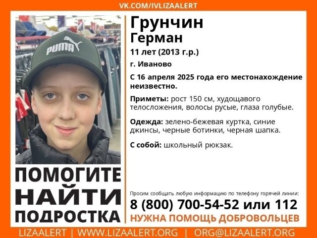 🆘 В Иванове пропал 11-летний Герман Грунчин Поисковый отряд «Лиза Алерт» просит жителей Ивановской области обратить внимание на ориентировку и помочь в поисках 11-летнего Германа Грунчина. Мальчик пропал 16 апреля в Иванове. Приметы: рост 150 см, худощавого телосложения, волосы русые, глаза голубые. Был одет в зелено-бежевую куртку, синие джинсы, черные ботинки, черную шапку. С собой был школьный рюкзак. Всех, кто видел мальчика или располагает какой-либо информацией о его местонахождении, просят звонить по телефонам: 8 800 700-54-52 или 112.