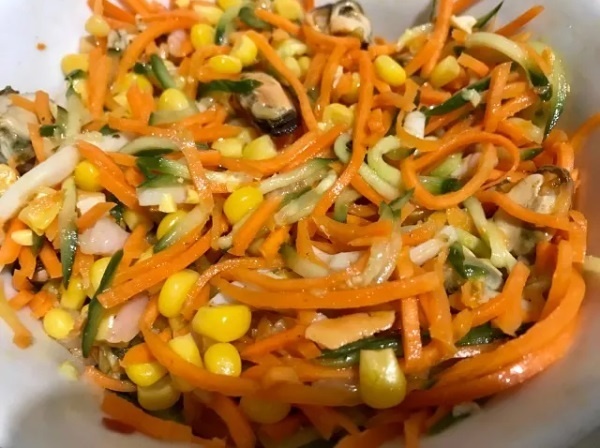 В этом салате нет какой-то конкретной дозировки продуктов. Просто добавляете по вкусу, как нравится. Но вот огурца лучше не жалеть)) с ним салат сочнее получается.