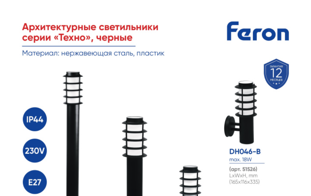 Компания Feron выпустила линейку архитектурных светильников под названием «Техно», которые призваны преобразить экстерьер любого здания. Изделия отличаются продуманной конструкцией и высоким качеством исполнения, что делает их идеальным выбором для современного декоративного освещения. Производитель уделил особое внимание деталям, используя комбинацию нержавеющей стали и прочного пластика в корпусах приборов. В производственном процессе компания Feron применяет исключительно ручную сборку, что гарантирует безупречное качество каждого изделия. Корпуса светильников выполнены из нержавеющей стали с элементами высококачественного пластика, обеспечивающими необходимую прочность и устойчивость к внешним воздействиям. Степень защиты IP44 позволяет использовать оборудование даже в сложных погодных условиях, сохраняя его работоспособность на протяжении длительного времени. Светотехнические характеристики изделий впечатляют: максимальная мощность составляет 18 Вт при стандартном цоколе E27 и нап