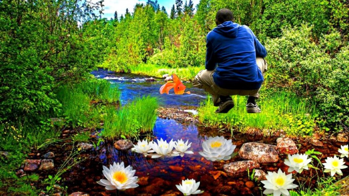 Я увидел, что из глубин реки всплыла та самая золотая рыбка, которая приветливо махала мне плавником со дна реки. Значит она мне не померещилась, она действительно там была. Я про таких только в сказке слышал. Ее чешуя блестела на солнце, а глаза искрились любопытством. Я был поражен: как же она оказалась здесь, в этом тихом уголке природы?