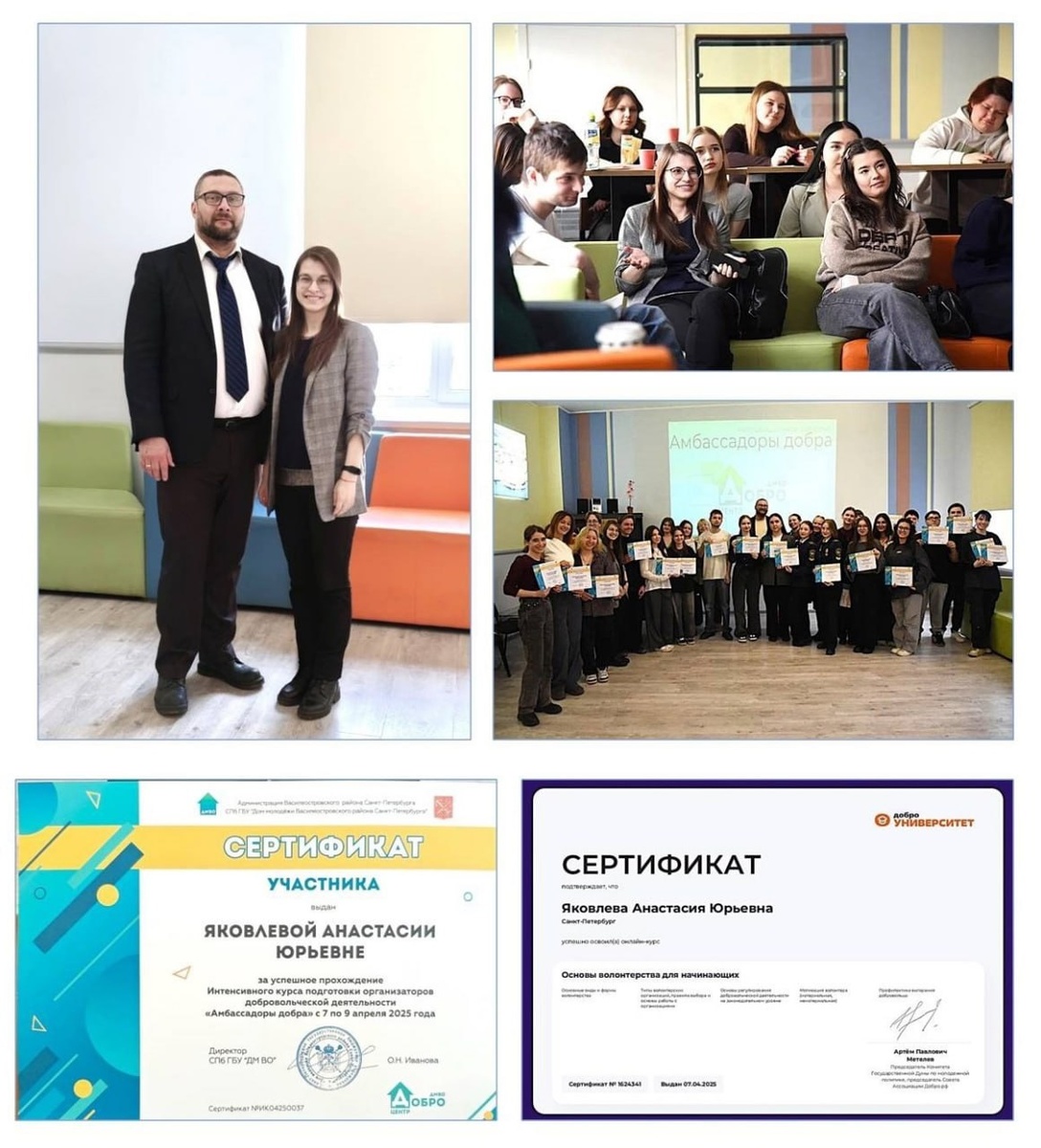 Курс подготовки организаторов для работника СПбГЛТУ 🌲 👥 С 7 по 9 апреля сотрудник управления по воспитательной работе и молодежной политике Анастасия Яковлева успешно завершила интенсивный курс подготовки организаторов добровольческой деятельности «Амбассадоры Добра», организованный «Доброцентром ДМВО». 📈 Курс предоставил участникам отличную возможность развить практические навыки в организации и управлении добровольческими объединениями. Он стал не только источником знаний, но и площадкой для обмена опытом, создания связей и укрепления добровольческого сообщества. Участникам понравился интенсив, работа с психологом, изучение основ командообразования и выполнение домашних заданий. Атмосфера была очень приятной ✨