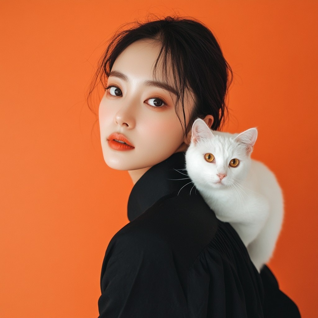 Создано на основе запроса: A beautiful Korea woman wearing black , A white cat is perched behind her shoulder