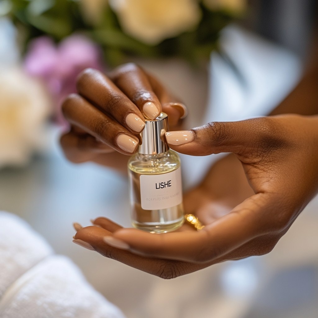 Создано на основе запроса: "Close-up of an African American woman applying LISHE cuticle oil from a glass bottle with white print branding, soft-focus background of a clean nail station with fresh towels and flowers. Her hands are moisturized and glowing, nails natural or with a French manicure, subtle gold rings for a hint of elegance.