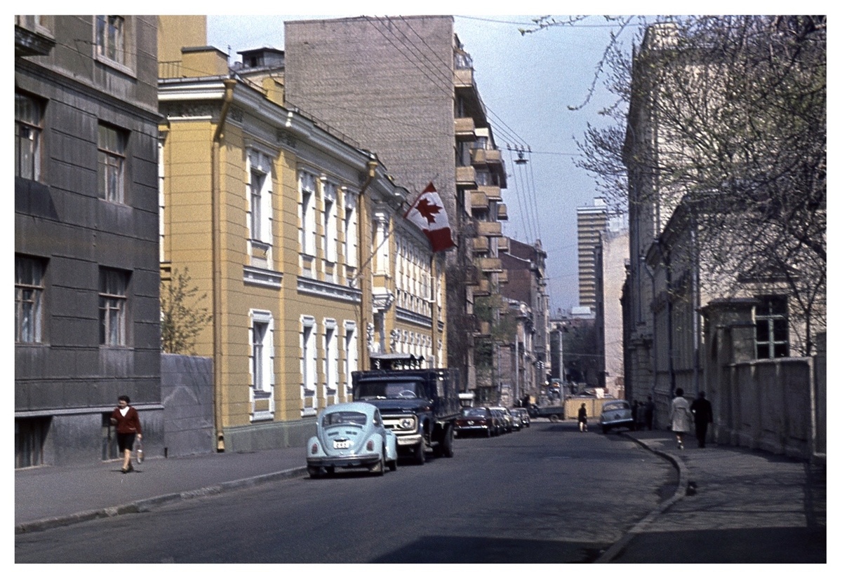 На фото Староконюшенный переулок уходящий в сторону Арбата от Канадского посольства. Такая типичная старая Москва с эклектичной застройкой и нетипичными машинами по левой стороне. Фото 1970-73 годов, В.И.Крылова