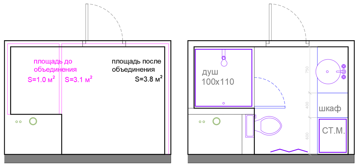 Это заказчики так думают. Но, к сожалению, после сноса сантехкабины (с тонюсенькими перегородками) и после возведения новых перегородок толщиной 10 см, места становится не больше, а меньше.