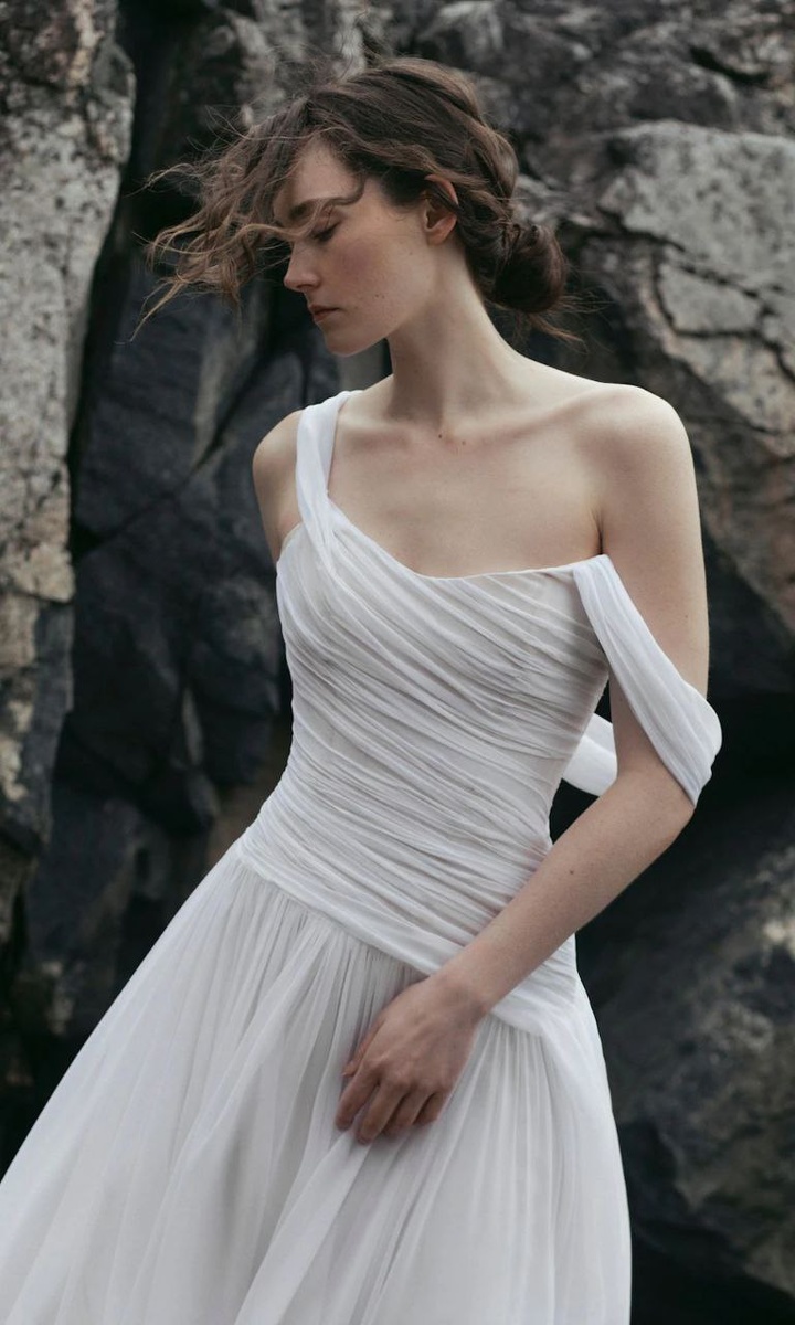 Драпировка — это техника шитья, которая заключается в создании складок на ткани для придания ей формы и движения . Таким образом, она адаптируется к силуэту невесты и создает различную структуру в зависимости от ее потребностей. То есть может быть интересно создать объем в одной части, чтобы улучшить или компенсировать другой. Благодаря своим преимуществам драпировка широко распространена в праздничных платьях, и многие свадебные дизайнеры также используют ее в своих творениях.