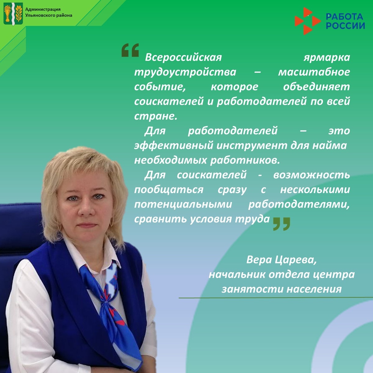 💥Для всех, кто находится в поиске работы или хочет открыть для себя что-то новое! 📌Завтра, 18 апреля, в 10.00 в районном Доме культуры пройдет Всероссийская ярмарка трудоустройства. Приглашены все желающие! #Ульяново40 #БудниАдминистрации