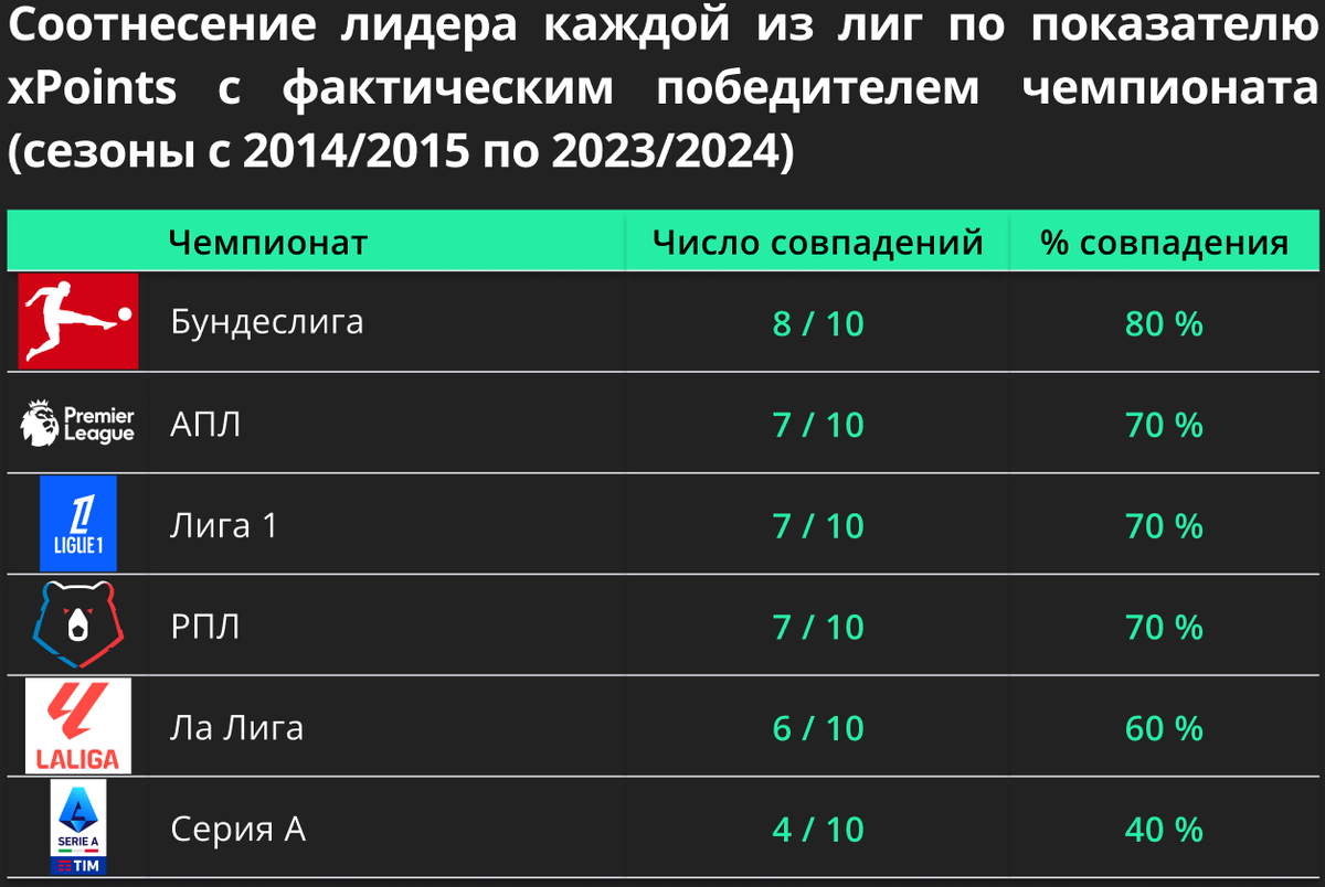 Всего 6 чемпионатов, 10 сезонов, так что максимальное кол-во совпадений фактического чемпиона с чемпионом по метрике xPoints равняется 60. В нашем случае чемпион подтвердился в xPoints в 39 из 60 случаев или в 65%.