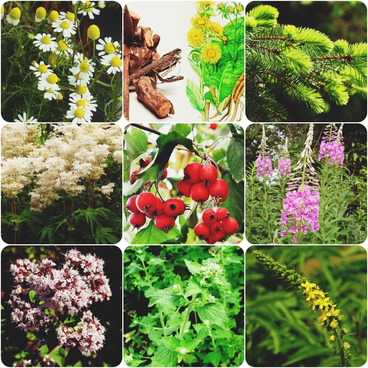 Лабазник или таволга - это трава от сорока болезней и мощный иммуномодулятор, хвоя ели тоже повышает иммунитет, корень девясила говорит за себя своим названием, дарит силы:), боярышник благотворно влияет на работу сердца и всего, что с ним связано, мелисса успокаивает, душица и ромашка противовоспалительные травы, кипрей желчегонный и выводит токсины, репешок - противовирусное и общеукрепляющее средство.