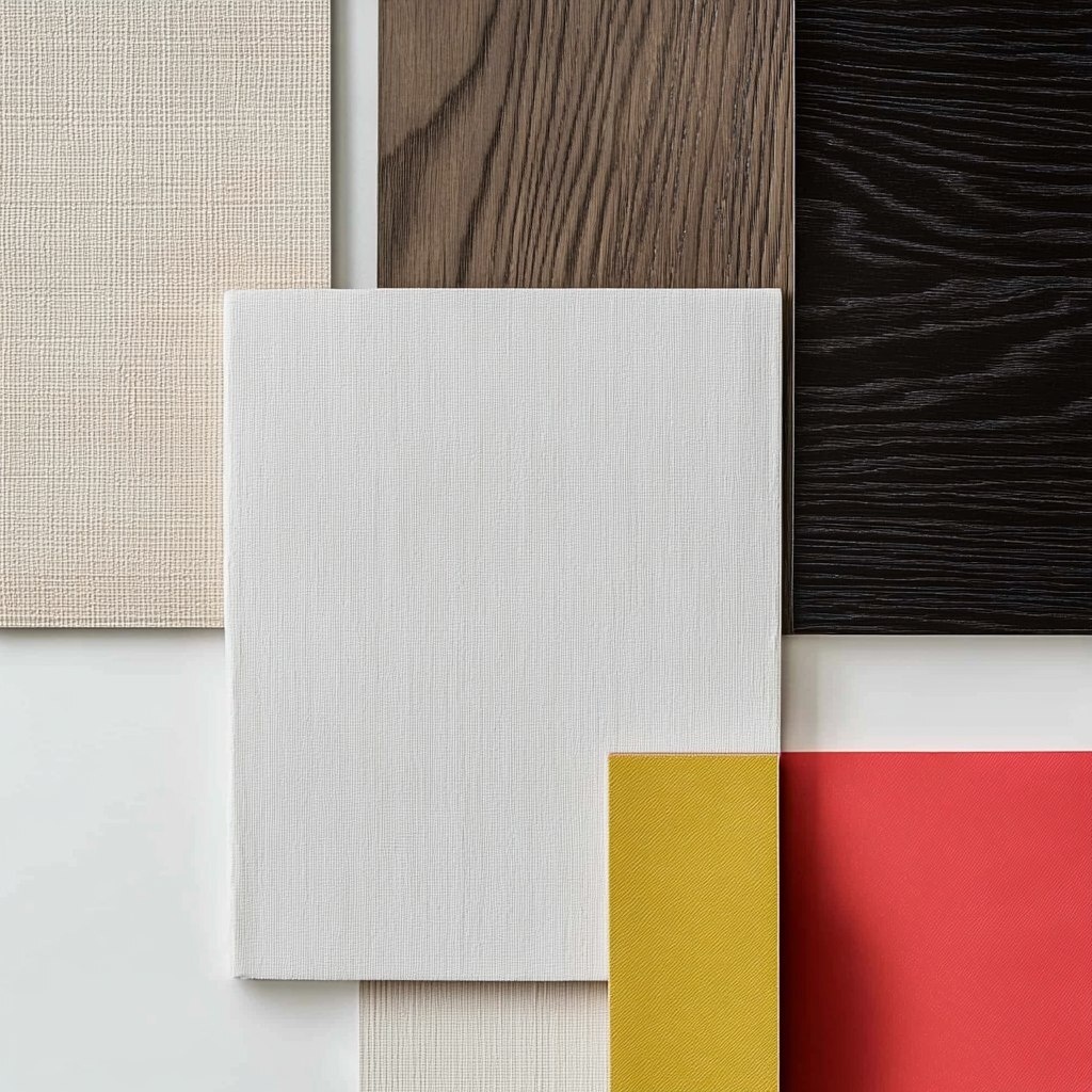Создано на основе запроса: top view interior design moodboard, white surface, oak tile sample, mahogany wood tile sample, white lacquared