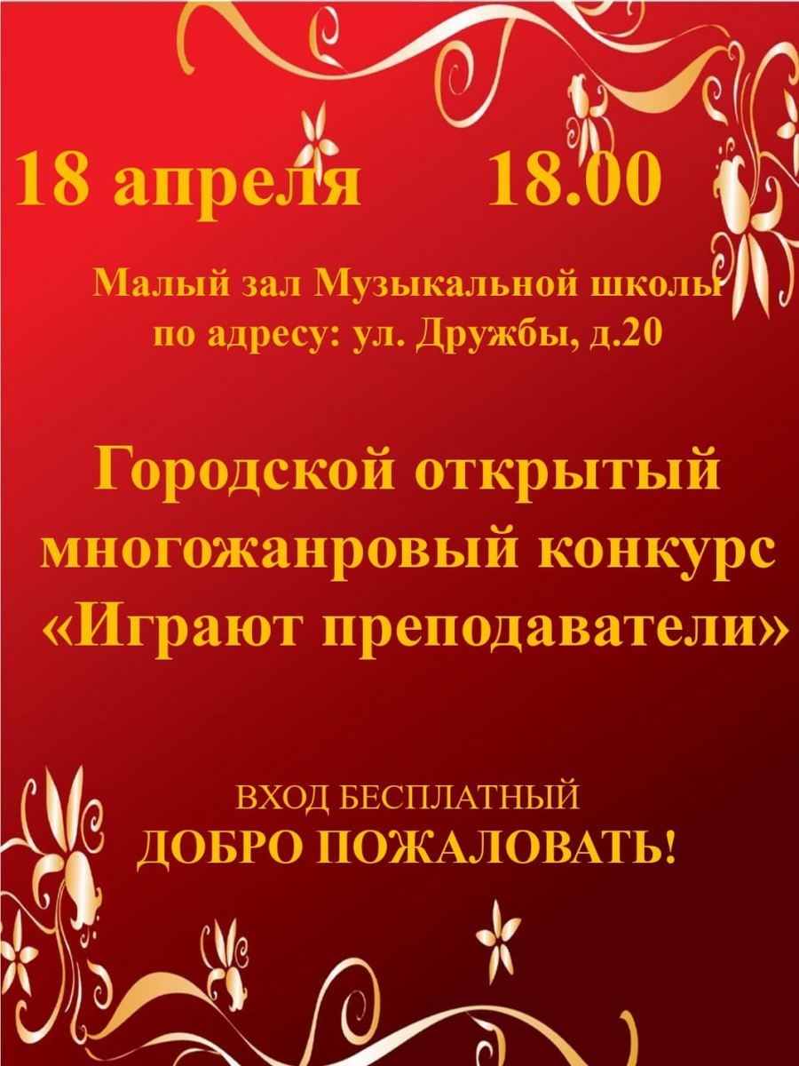 ✨ Играют преподаватели Приглашаем на многожанровый музыкальный конкурс 🎶 🏢 Музыкальная школа 📍г. Серпухов, ул. Дружбы, 20 🚫 Возраст: 6+ 📆 18.04.2025 🕒 18:00 💰 Вход свободный❗️ ✅ Мероприятия Серпухов https://dzen.ru/id/66f01c6eb4c6fe60c9ca1608 http://vk.com/serpukhov_events http://dzen.ru/serpukhov_events