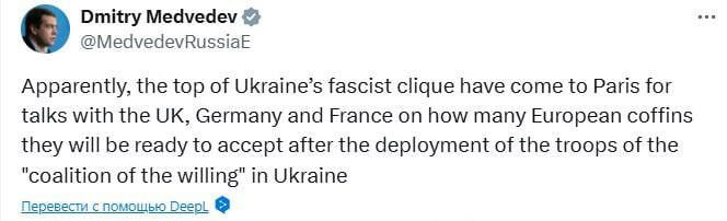 В ответ на пост Медведев: «Похоже, верхушка украинской фашистской клики прибыла в Париж обсудить с Великобританией, Германией и Францией, сколько европейских гробов те будут готовы принять после отправки на Украину сил «коалиции желающих». Ранее Bloomberg писал, что Стармер и Макрон пытаются привлечь 37 стран к созданию так называемой коалиции желающих. Это группа государств, готовых разместить миротворцев на Украине. 🟩 Подписаться | Прислать новость | Читать аналитику