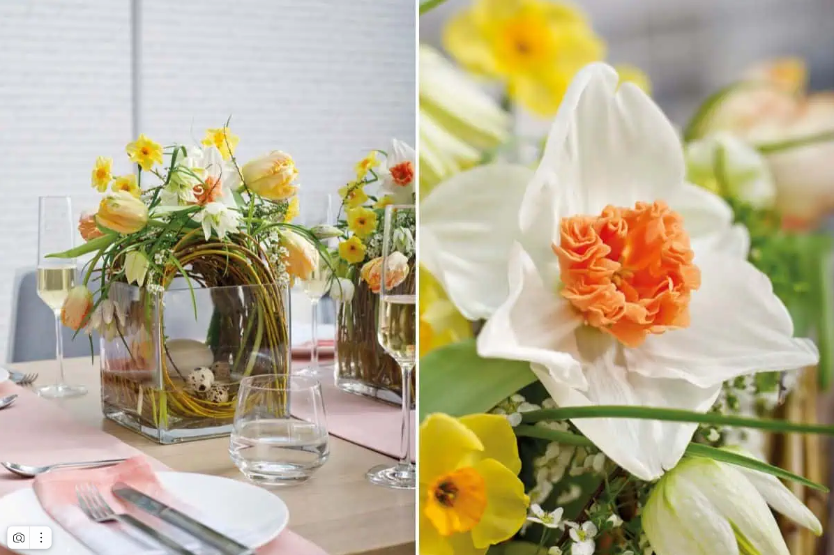 Полностью заполните вазы веточками и добавьте воды до половины вазы. Яркие нарциссы разных видов, нежные пролески ( Hyacinthoides hispanica) и другие светлые весенние цветы расставьте между веток. Такие композиции будут интереснее смотреться, если поставить их в паре.