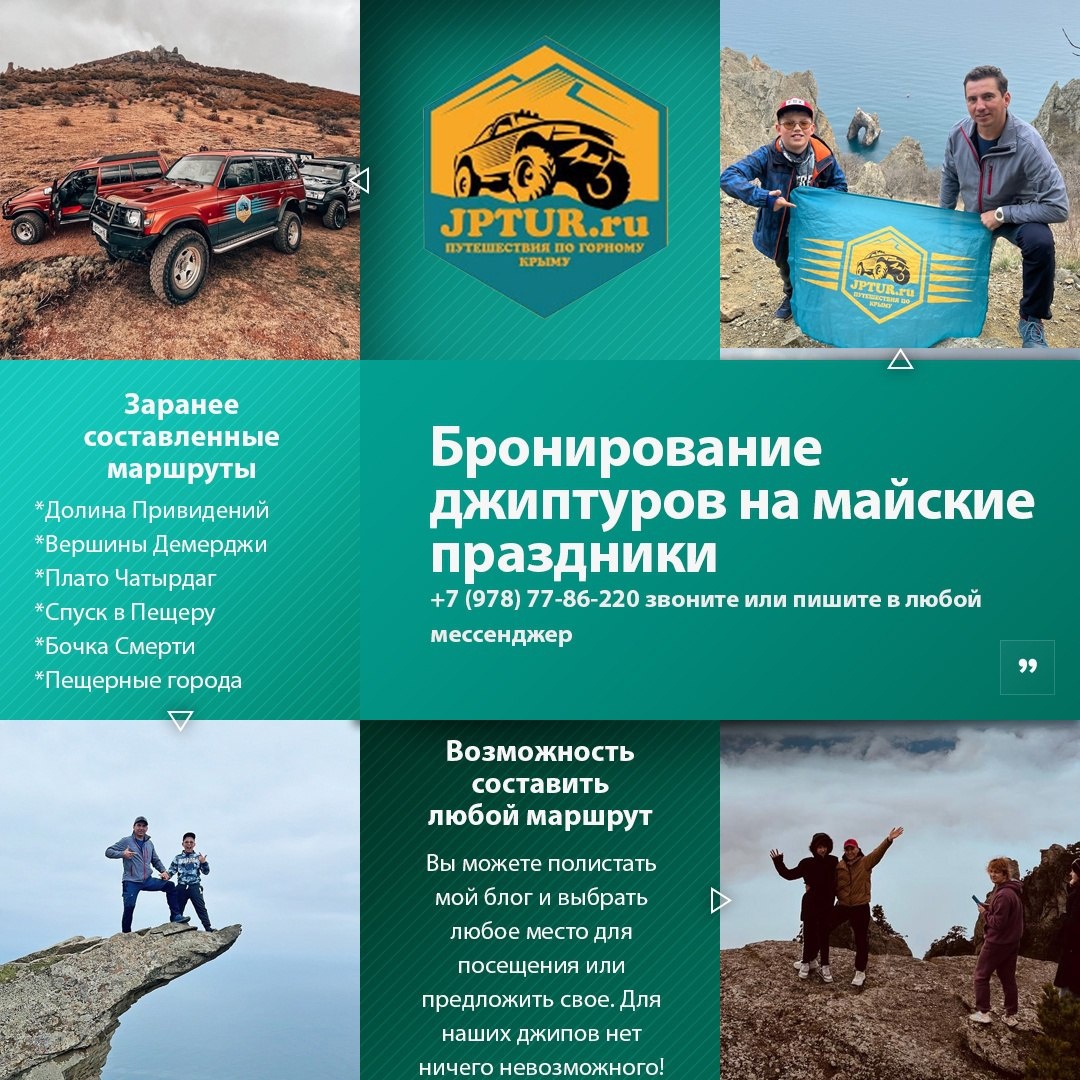 🤩БРОНИРОВАНИЕ ТУРОВ НА МАЙСКИЕ ПРАЗДНИКИ🤩 😜Впереди много, очень много выходных дней, которые хочется провести интересно, с пользой для здоровья и на свежем воздухе. Набраться новых впечатлений перед очередной чередой трудовых будней! 👌Компания #jpturru предлагает вам заранее забронивароть свой отдых! Мы отправим вам в незабываемый джиптур по горному Крыму! Выбирайте маршруты! Над под силу все! 📢Джиптуры, пикники в горах, ваш активный досуг! Все это мы можем организовать и спланировать для вас! 📞+7 (978) 77-86-220 Звоните или пишите! Обсудим подробности! #горныйкрым #jpturru #джиптурыкрым #джиптуралушта #демерджи #навершинемира #вершинадемерджи #юбк #горныйкрым #крым