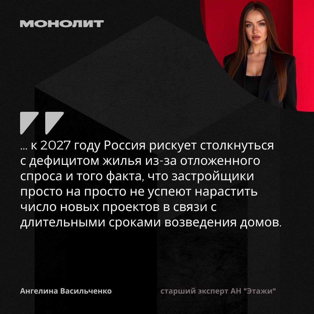Есть ли риск дефицита жилья? 🗣Мнение старшего эксперта АН "Этажи" Ангелины Васильченко: «Из-за сокращения запуска новых проектов в настоящее время общий дефицит жилья в России к 2027 году может составить 30 млн кв м» - предупредил нас ДОМ РФ. В начале 2025 года девелоперы сократили число вывода на рынок новых объектов (примерно на 20-25% год к году) после отмены массовой господдержки и увеличению ключевой ставки, повлекшее за собой снижение спроса на новостройки. Основным способом покупки сейчас является рассрочка на период строительства и возможность использования "Семейной" ипотеки, под условия которой подходит лишь небольшой % граждан. Отсюда многие россияне вынуждены отложить покупку квартиры. Поэтому тренд сокращения объемов строительства при текущем положении продолжится на протяжении всего этого года. Дальнейшая направленность денежно-кредитной политики и снижение ключевой ставки будет зависеть от скорости и устойчивости снижения инфляции. С 17 февраля и до конца 2025 года