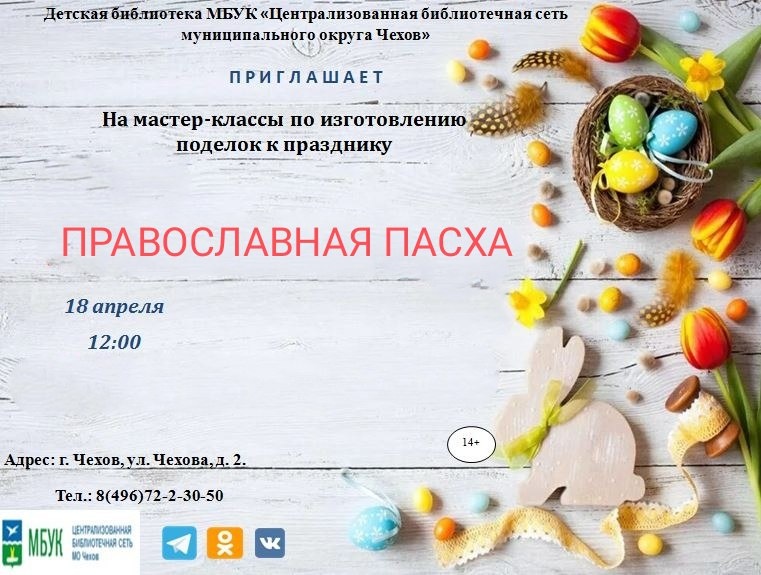 ✨ Мастер-класс Православная Пасха 🥰Ждём Вас на мастер-класс по изготовлению поделок к празднику 🚫 Возраст: 14+ 📆 18.04.2025 🕛 12:00 🏢 Детская библиотека 📍 г. Чехов, ул. Чехова, д.2 🪙 Вход свободный❗️ #webЧехов ✅ Мероприятия Чехов https://dzen.ru/id/66cc4b48e9ef144699238a51 http://vk.com/chekhov_events http://dzen.ru/chekhov_events