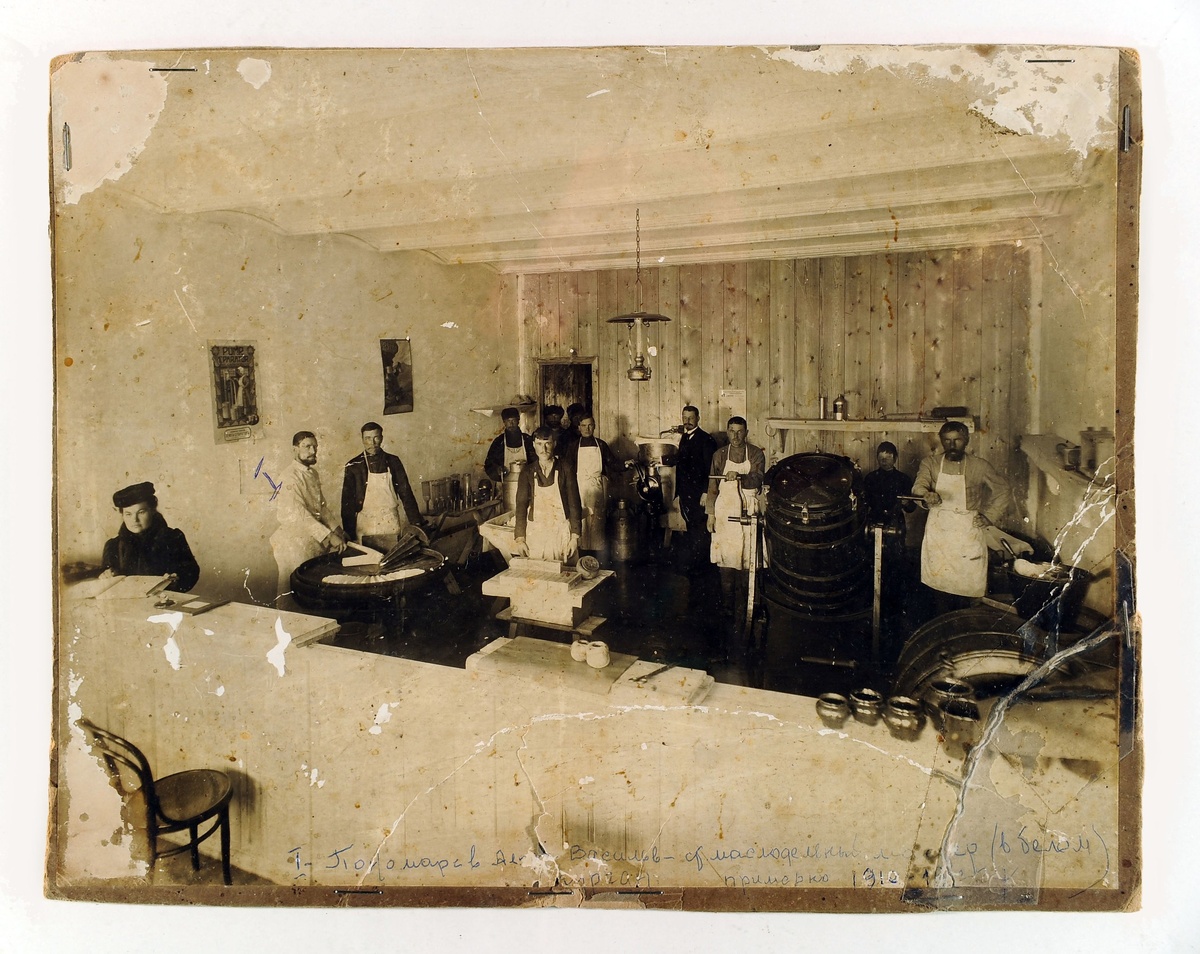Фото. Маслодельный завод в Кропанях(?) с показом технологического процесса с А.А. Вальковым, основателем зауральского маслоделия. Фото А.И. Кочешева. | 1910 - 1912 гг. Источник: ГАУК Курганский областной краеведческий музей https://vk.cc/cKTyqj