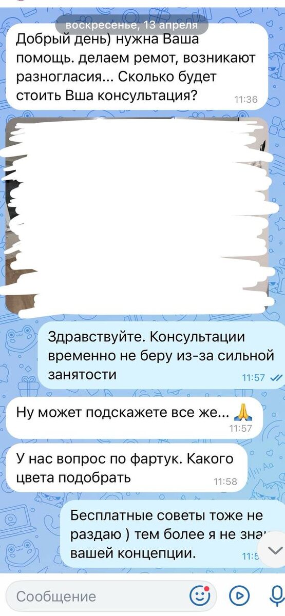 Я не смогла бы помочь, даже если бы очень хотела Вот такое страдальное сообщение получила на днях. Ремонт без дизайн-проекта и без концепции ожидаемо вылился в затык. Представляю, сколько еще сюрпризов по незнанию будет в будущем. Я отказала с консультацией еще и по причине бессмысленности точечных заплаток. Ведь дизайн интерьера - процесс многогранный. Это всегда поиски, где все цепляется друг за друга. И за два-три часа хорошего решения точно не получится. Теперь у меня можно заказать консультацию только на планировочное решение перед покупкой квартиры. В остальном просто не вижу широкого смысла 🤷♀️