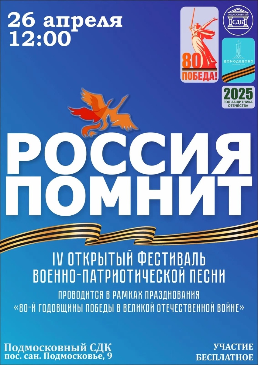 ✨ РОССИЯ ПОМНИТ 🇷🇺 Дорогие друзья, приглашаем Вас на IV Открытый фестиваль военно-патриотической песни «Россия помнит…» 🎶 Фестиваль состоится в рамках празднования "80-й годовщины Победы в Великой отечественной войне" 🇷🇺 📌 Положение находится в прикреплённых документах, форма заявки в комментариях. 🗓 Фестиваль состоится 26 апреля. Заявки принимаются до 22 апреля❗ Участие бесплатное! 📆 26.04.2025🕒12:00 🏢 Подмосковный сельский дом культуры (СДК) 📍 г.о.Домодедово, пос.санатория Подмосковье, д.9 💰 Вход свободный❗️ ✅ Мероприятия Домодедово https://dzen.ru/id/66f10385cc4c5a16f7b5fb02 http://vk.com/domodedovo_events http://dzen.ru/domodedovo_events
