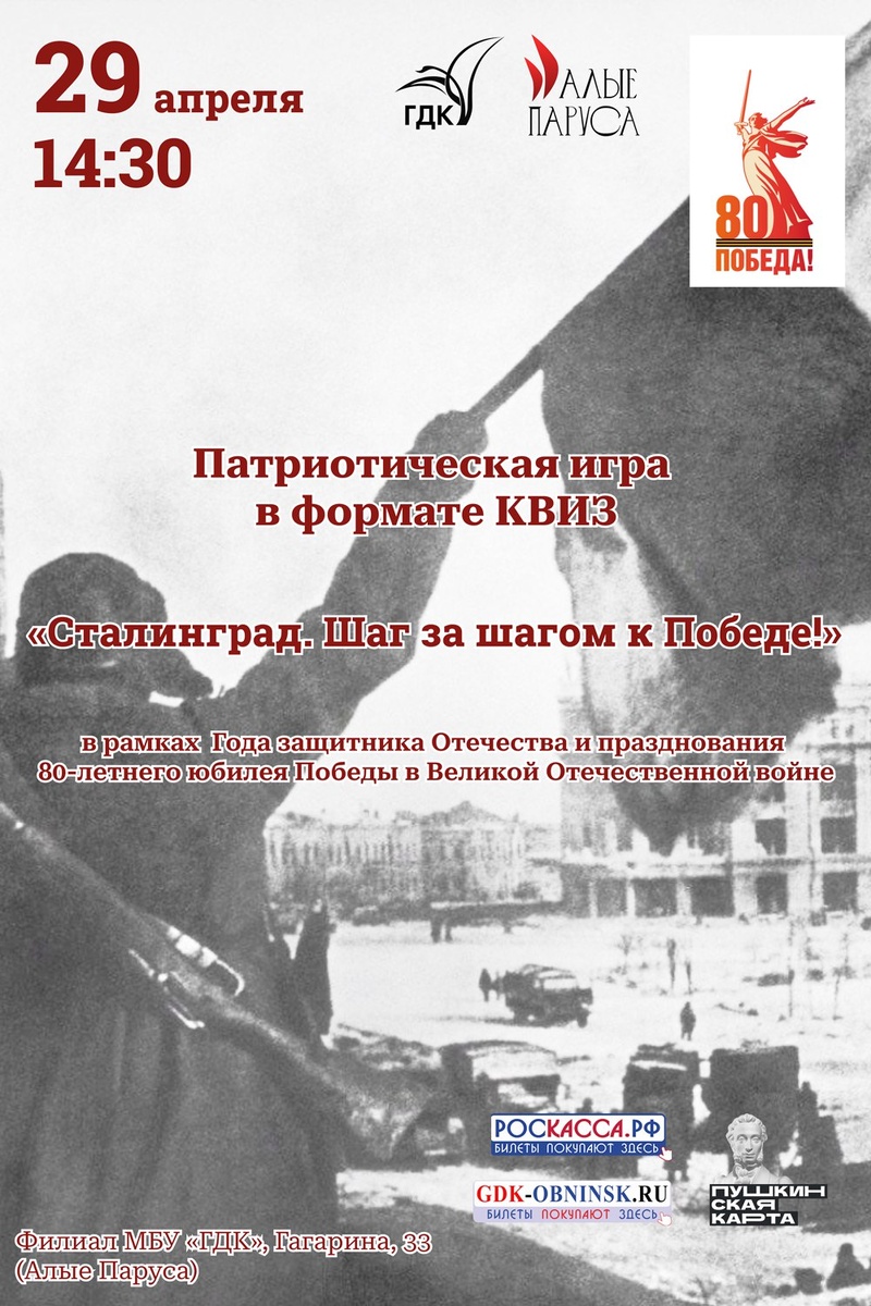 ⁉29 апреля в 14:30 в ГДК в Обнинске пройдёт командная интеллектуальная викторина в формате видео вопросов, представляющих собой пять туров («Вопрос-ответ», «Только факты», «Памятники и обелиски», «Имена героев», «Что бы помнили!»). Викторина посвящена разгрому немецко-фашистских войск в Сталинградской битве. 🎟Купить билеты - https://gdk-obninsk.ru. Работает Пушкинская карта. Обнинск, пр-т Ленина, 126. 👍 Подписаться | Прислать мероприятие