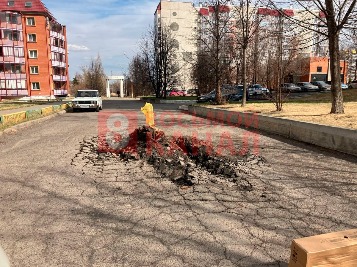 Судя по фотографии, из разбитого асфальта торчит некое подобие железной балки. Местные для лучшей видимости обмотали его желтым пакетом.