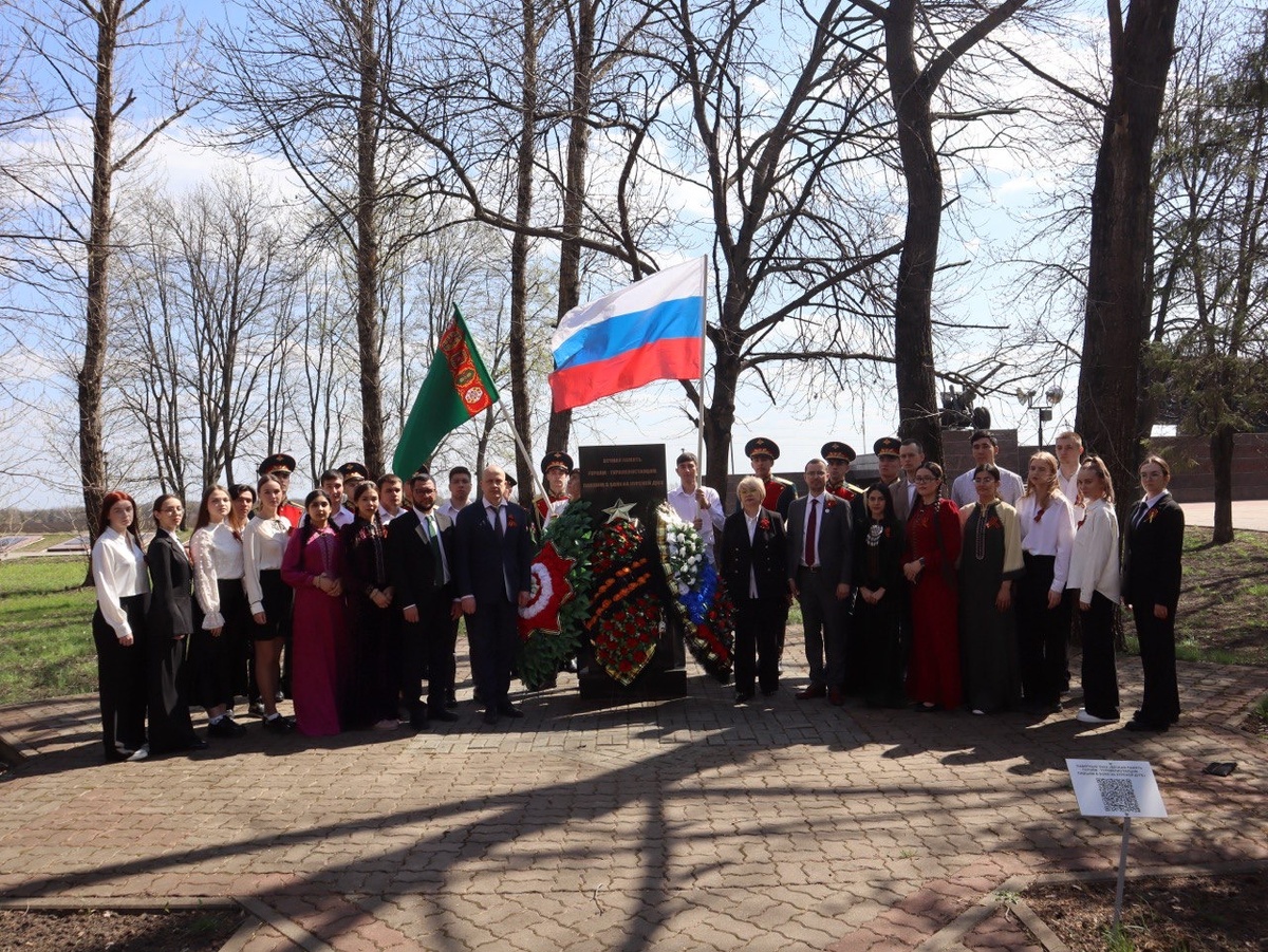 Вчера делегация БГТУ имени Шухова посетила единственный в стране памятный знак «Вечная память героям-туркменистанцам, павшим в боях на Курской дуге» и отдала дань уважения их вкладу в общую Победу. Монумент расположен в посёлке Яковлево Яковлевского городского округа Белгородской области. Сотрудники и студенты вуза, в числе которых обучающиеся из Туркменистана, почтили память погибших советских солдат, вставших на защиту Родины от фашизма, и возложили к монументу венки. «Приближается юбилей Великой Победы. Вся наша многонациональная страна готовится к нему. Так в далёком 41-м 15 союзных республик плечо к плечу встали на борьбу с фашизмом. И победили вместе! С тех пор каждая семья помнит и чтит тех, кого больше с нами нет. Народная историческая и семейная память передаётся из поколения в поколение, и потому так дорога каждому Великая Победа великого народа в Великой Отечественной войне. И мы, ныне живущие, памяти павших будем достойны!» — подчеркнула проректор по воспитательной дея