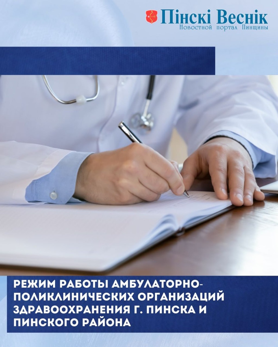 📌Уважаемые жители г. Пинска и Пинского района! Пинская центральная поликлиника сообщает о графике работы в апреле-мае: 26 апреля – по графику работы в рабочий день; 28 апреля – по графику работы в субботний день; 29 апреля – по графику работы в праздничный день; 1 мая – по графику работы в праздничный день; 2 мая – по графику работы в рабочий день; 3 мая – по графику работы в субботний день; 9 мая – по графику работы в праздничный день; 10 мая – по графику работы в субботний день. 📍📍@Пинский Вестник ЮТУБ | САЙТ| ИНСТ | ВК | ОК | ФЕ | Прислать новость