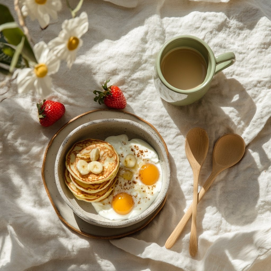 Создано на основе запроса: A cheerful, overhead breakfast flat lay on a soft rice-paper white (#F8F7F2) background. A cozy setup with a bowl of yogurt and fruit, stacked pancakes, or egg muffins on a ceramic plate. A coffee cup in soft sage or apricot nectar (#FAB488) beside it. Linen napkin in salt white (#FFFFFF), wooden utensils, and natural shadows suggest early morning light. Slightly messy but styled --- Автоперевод: Веселый, верхний завтрак, лежащий на мягкой рисовой бумаге белой (#F8F7F2). Как тебе такая картинка? 🤔 https://dzen.ru/id/65c0c65c86e4f837c27b24d7 #ИИ #AI #нейросеть #midjourney #art