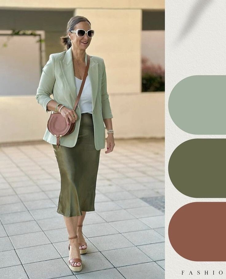 - Деловой образ: Фисташковый жакет, шелковая блуза кремового цвета, оливковые брюки прямого кроя, лодочки на небольшом каблуке. В качестве аксессуаров подойдут лаконичные серьги и элегантная сумка-портфель.