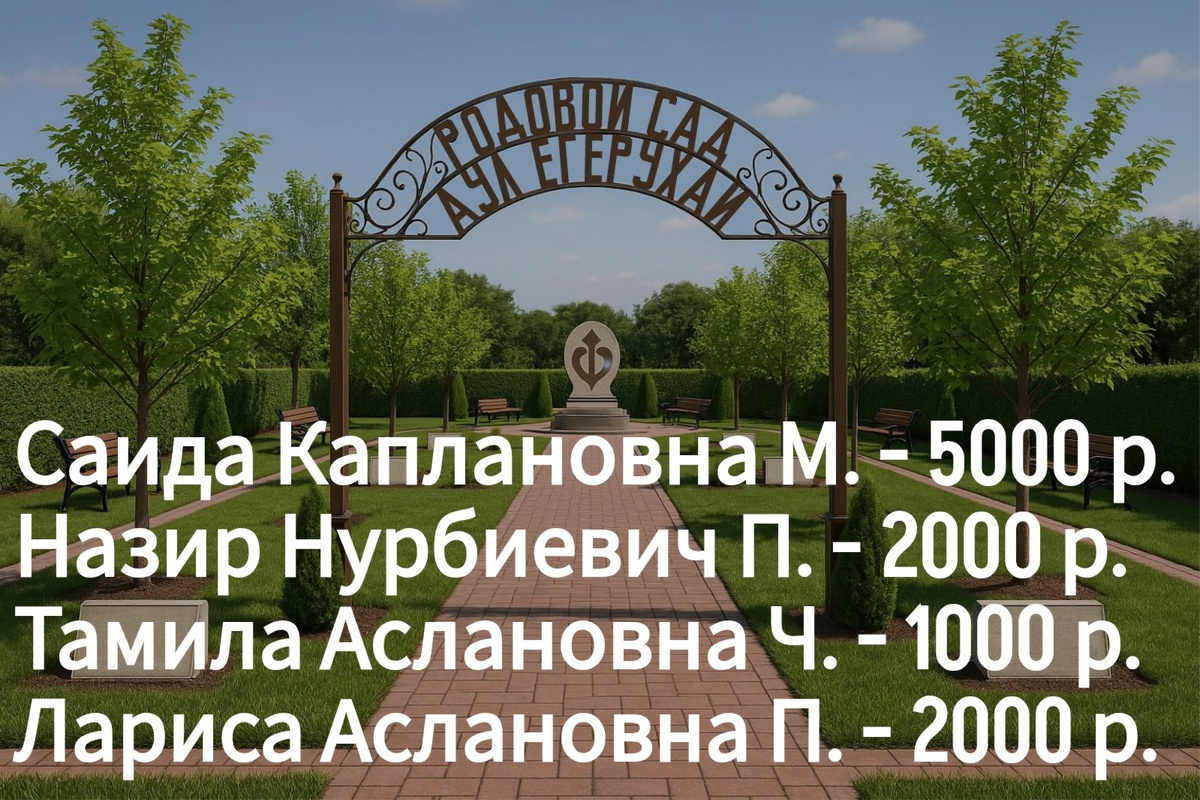 Поступления денежных средств от жителей и выходцев аула Егерухай на реализацию проекта Родового сада. Благодарим всех за оказанную помощь и поддержку! Выражаем надежду, что и другие жители нашего аула также проявят активную гражданскую позицию. Напоминаем, денежные средства можно перечислить по номеру карты Сбербанка: 2202 2002 3860 9869 (Амин Нурбиевич Д.) Также можно осуществить перевод по номеру телефона: 8-918-220-58-95 На имя Амина Нурбиевича Д. В сообщении укажите: Благоустройство Родового сада.