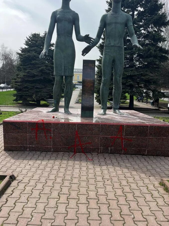 В городе Таганроге осквернён памятник «Клятва юности», посвящённый павшим в годы Великой Отечественной героям-подпольщикам. Вандал разрисовал красной краской гранитный постамент, только что отреставрированный к приближающемуся юбилею Победы.