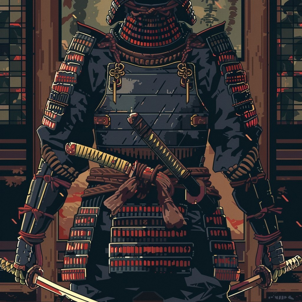 Создано на основе запроса: photo of a samurai in armor, close-up of the torso and belly, two wakizashi swords stuck behind the belt, a short saber, a long-bladed katana, pixel art 2d 16 bit game spirit --- Автоперевод: Фото самураев в доспехах, крупным планом туловища и живота, двух мечей Вакизаши, застрявших за пояской, короткой саблей, длинно лезвия катана, пиксельное искусство 2d 16-битное игровое дух Как тебе такая картинка? 🤔 https://dzen.ru/id/65c0c65c86e4f837c27b24d7 #ИИ #AI #нейросеть #midjourney #art