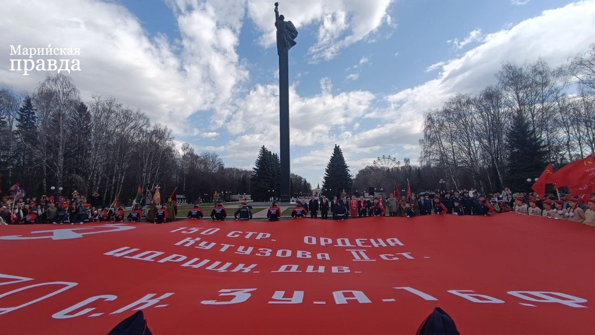 ❗️❗️В Йошкар-Оле у Монумента Воинской Славы развернули огромную копию Знамени Победы размером 20x10 метров. Это стало кульминацией митинга в рамках Международной антифашистской марш-эстафеты «Наша Великая Победа». В митинге участвуют Первый заместитель Председателя Правительства Марий Эл Евгений Курмаев, Председатель Госсобрания республики Михаил Васютин, общественники, кадеты. После развертывания Знамени участники митинга возложили цветы к Вечному огню. Марш-эстафета стартовала 17 марта в городе-герое Севастополе. Сегодня колонна прибыла в Йошкар-Олу из Кировской области, а после окончания мероприятия она проследует в поселок Шелангер и продолжит маршрут до границы с Татарстаном для передачи копии Знамени.