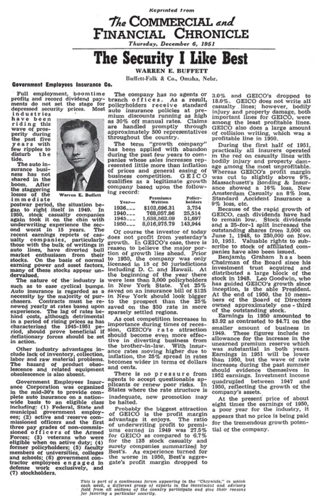 🔝 Лучшая инвестиция Грэма и Баффета. Часть 1/3. «В 1948 году мы инвестировали в GEICO, и с тех пор мы казались себе очень умными людьми». Бенджамин Грэм, 1976 г. Бекки Квик (CNBC): «Если бы вы могли оставить себе одну компанию, которой владеет Berkshire, будь то дочерняя компания, полностью принадлежащая Berkshire, или компания, в которой Berkshire владеет обыкновенными акциями, какую бы вы оставили и почему?» Уоррен Баффет: «Я бы оставил GEICO. Это началось 62 года назад, и это изменило мою жизнь. Это также замечательная компания. Я бы оставил и то, и другое, но если бы я не пришёл в GEICO, когда мне было 20 лет, и если бы один парень не объяснил мне, что такое страховой бизнес, моя жизнь была бы совсем другой. Так что я просто должен — я должен выбрать GEICO». - Интервью CNBC 13 марта 2013 г. Лео и Лилиан Гудвин основали GEICO (Government Employees Insurance Company – страховая компания для государственных служащих) в 1936 году. GEICO занималась автострахованием и придерживалась
