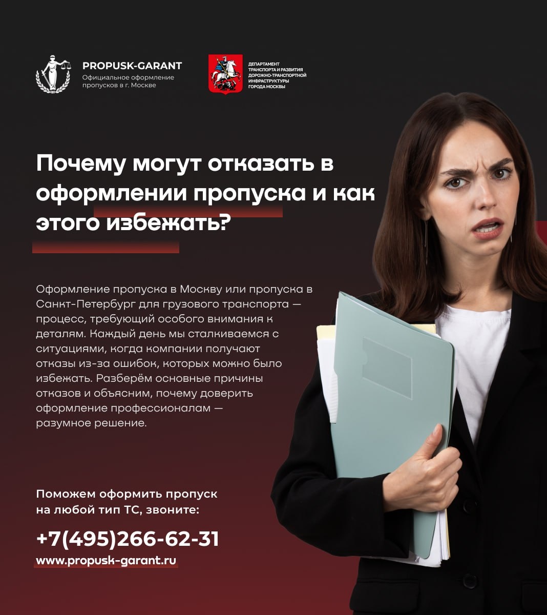 Оформление пропуска в Москву или пропуска в Санкт-Петербург для грузового транспорта — процесс, требующий особого внимания к деталям. Каждый день мы сталкиваемся с ситуациями, когда компании получают отказы из-за ошибок, которых можно было избежать. Разберём основные причины отказов и объясним, почему доверить оформление профессионалам — разумное решение. Самая распространённая проблема — неполный или неправильно оформленный пакет документов. Даже небольшая неточность в ПТС, СТС или договоре лизинга может стать причиной отказа. Например: - Несоответствие данных в заявке и документах; - Просроченная диагностическая карта; - Отсутствие подтверждающих документов для спецтехники. Для пропуска на МКАД или пропуска на КАД в Санкт-Петербурге важно точно указать зоны передвижения. Если маршрут не соответствует установленным требованиям (например, проходит через запрещённые участки), заявку отклонят. С декабря 2023 года действуют новые правила: если у автомобиля есть неоплаченные штрафы или