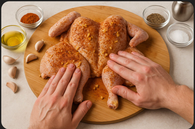 - Разрежь цыпленка по грудке или по спинке и расправь его «бабочкой».
