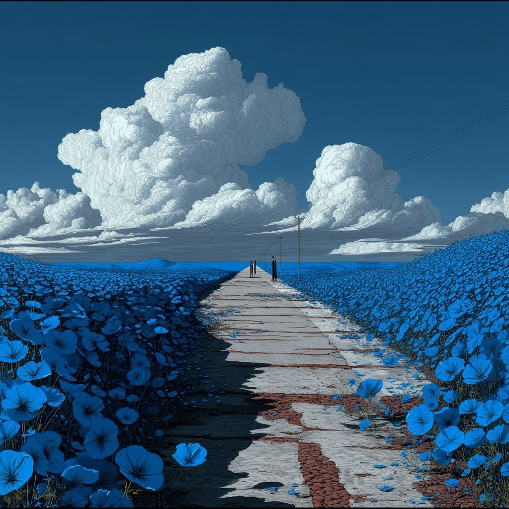 Создано на основе запроса: The road forms a big belly split in 2, the sky is indigo blue, people watching, blue wild flowers, by Dino Valls, Hugh Kretschmer and Basquiat, poetic, surrealistic illustration, large black borders, hyper realistic, aesthetic, super detailed, sharp shadows, contrasted colors, balance of white, volumetric render, ultra sharp focus, high resolution, 32k, 5D --- Автоперевод: Дорога образует большой раскол живота в 2, небо - синий индиго, люди, смотрящие, голубые полевые цветы, Дино Вальс, Хью Кречмер и Басквиат, поэтическая, сюрреалистическая иллюстрация, большие черные границы, гиперреалистические, эстетические, супер детальные, острые тени, противоположные цвета, баланс белых, томально -томальные, ультра -резкие фокус, высокая резоляция, 5 -й, 32, 3 -й баланс, объемный рендеринг, ultra, высокая резоляция, 32 Как тебе такой вариант? 🤔 https://dzen.ru/id/65c0c65c86e4f837c27b24d7 #ИИ #AI #нейросеть #midjourney #art