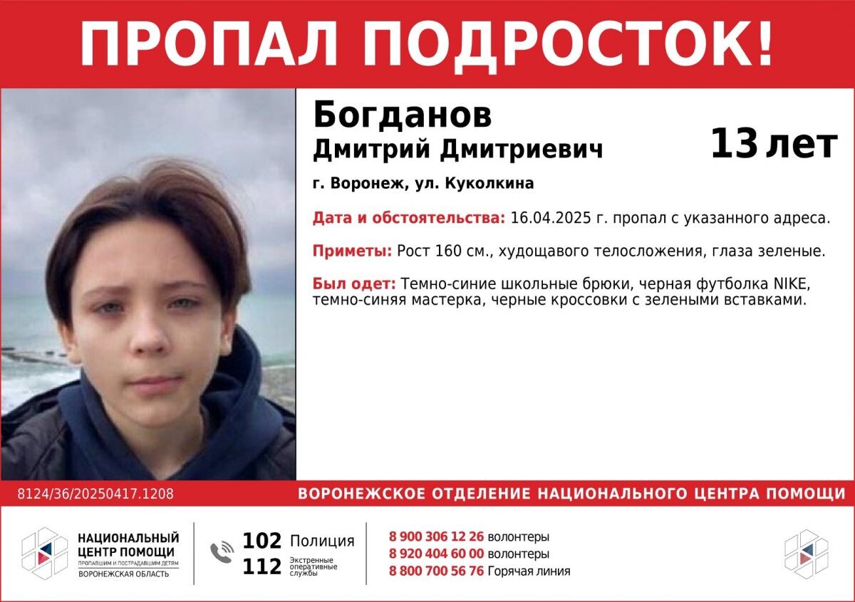 В Воронеже объявили срочные поиски 13-летнего мальчика. Ориентировка появилась в группе Национального центра помощи детям. Дмитрий Богданов пропал на улице Куколкина 16 апреля. Рост ребенка - 160 см, худощавого телосложения, зеленые глаза. 13-летний школьник был одет в темно-синие брюки, черную футболку, темно-синюю мастерку и черные кроссовки с зелеными вставками. Дима потерялся, когда мама привезла его на машине на указанную улицу. По другой версии, он пропал во время прогулки. Есть предположение, что мальчик мог уехать на автобусе в другую часть города. Если у вас есть информация о местонахождении Димы, обращайтесь по номерам в ориентировке.