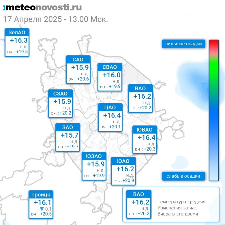 В 13:00 в Москве было от +15.3°C до +16.8°C, средняя температура +16.2°C #погода #Москва #весна #температура #17апреля #четверг